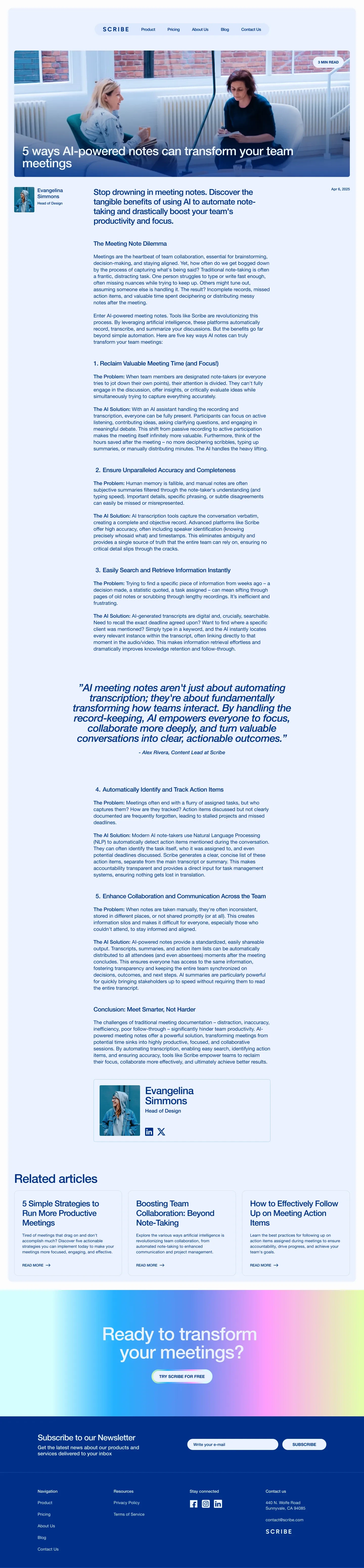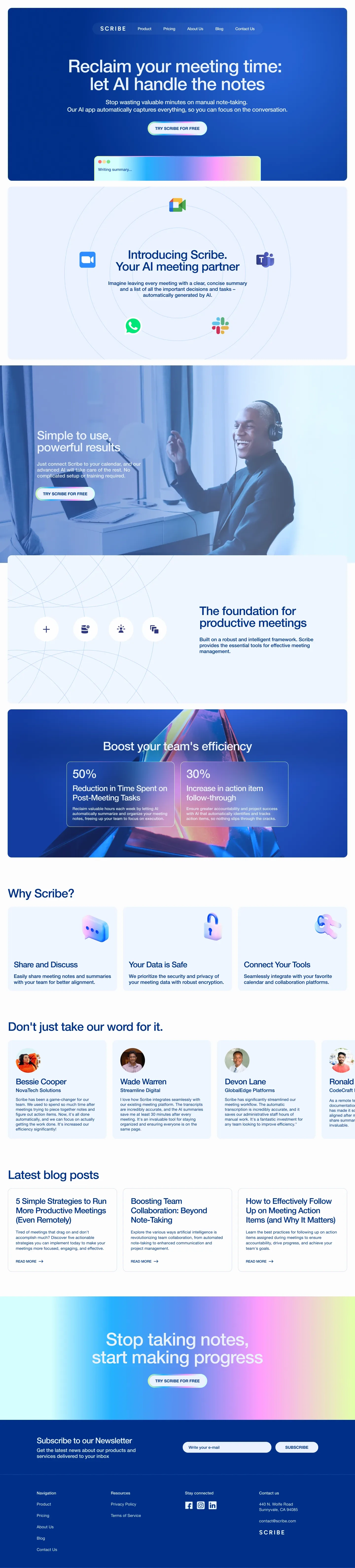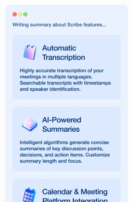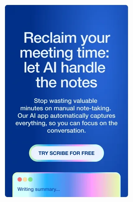 Scribe is an AI-powered meeting notes app that automatically records, transcribes, and summarizes your meetings. It captures key decisions and action items, freeing you from manual note-taking so you can focus on the conversation.
